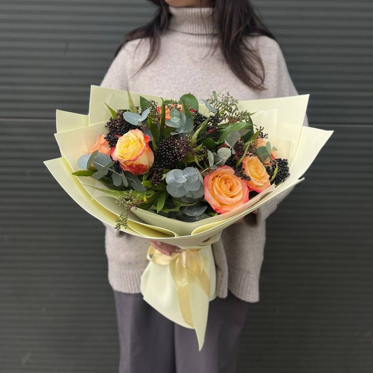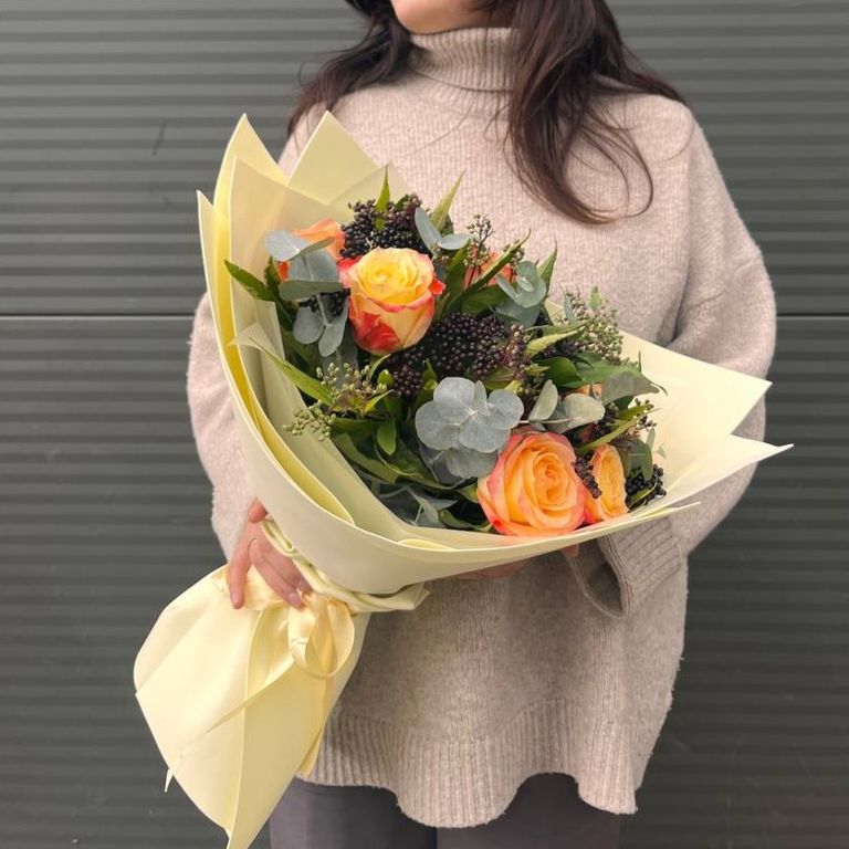Букет с ягодами бузины и яркими классическими розами Эквадор.