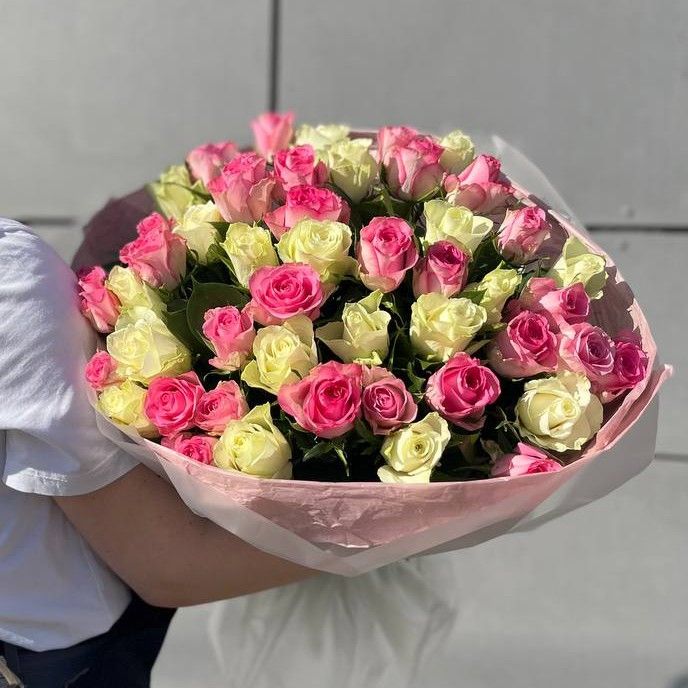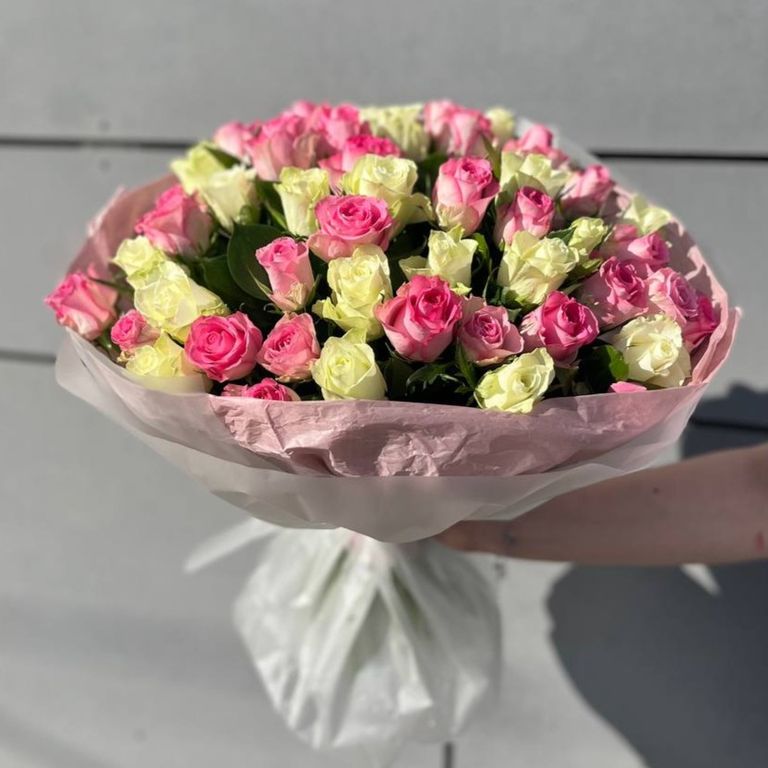Объемный букет из небольших кенийских роз нежного оттенка, который идеально подойдет в качестве подарка на день рождения, свадьбу или другое приятное событие.