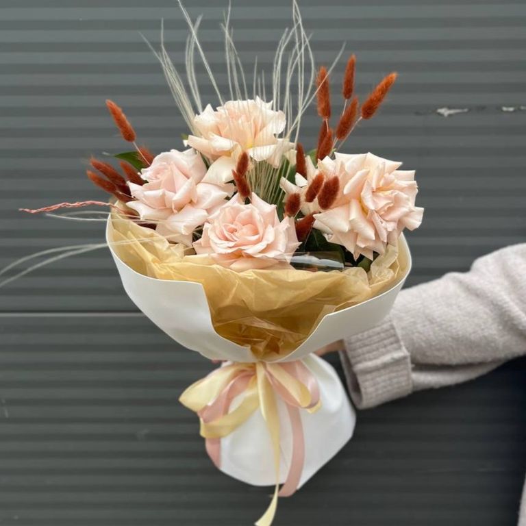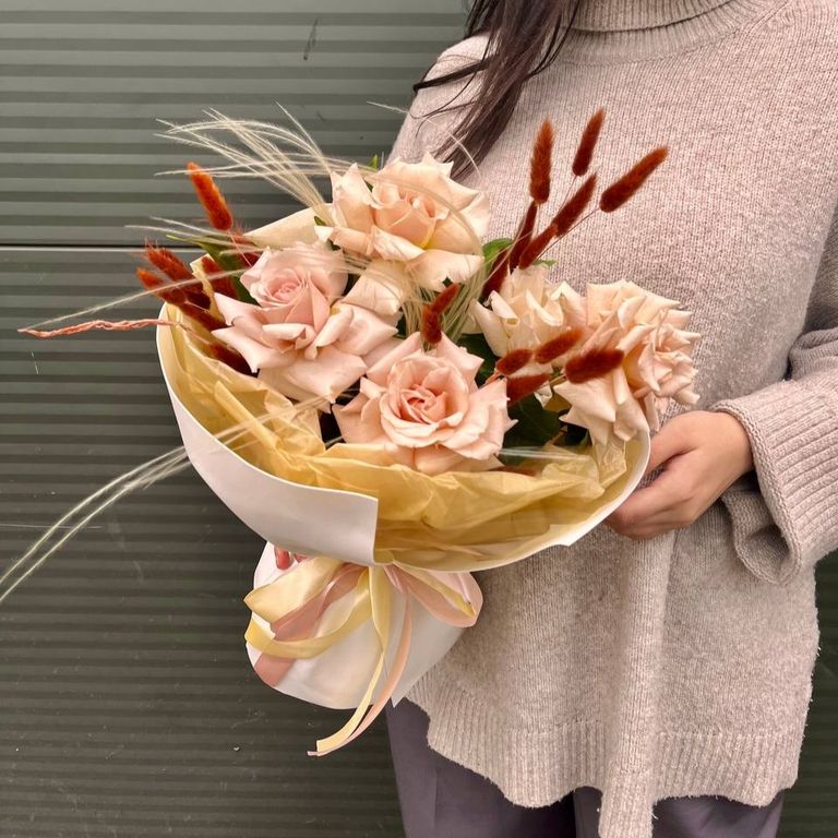 Букет из 5 кремовых французских роз с сухоцветами в осенних оттенках, с доставкой по Туле и области
