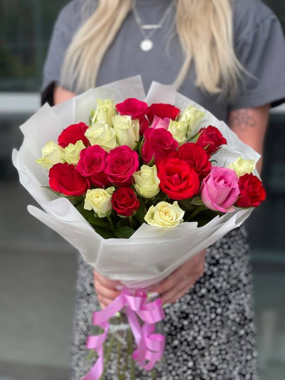 Яркий букет из 25 роз Кения 50 см для вашего события.