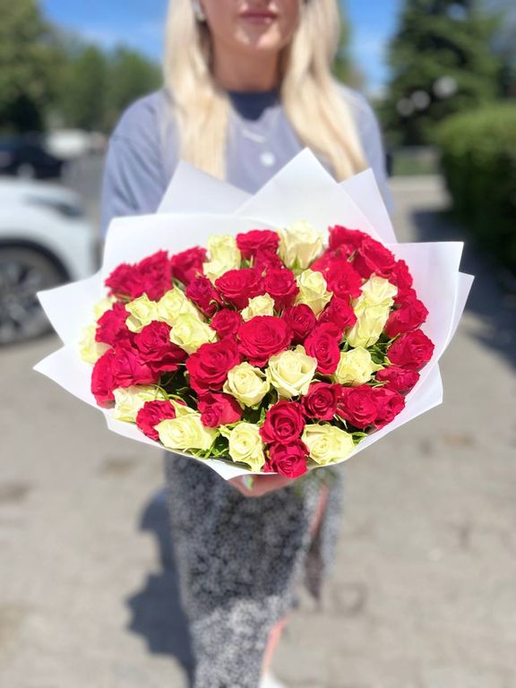 Яркий букет из 51 розы Кения 50 см напрямую с плантации.