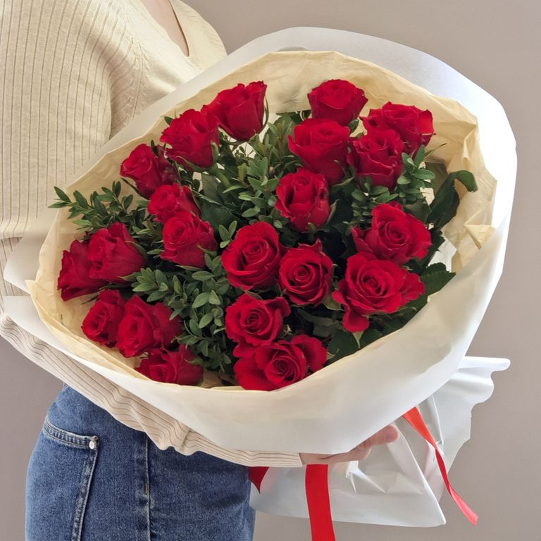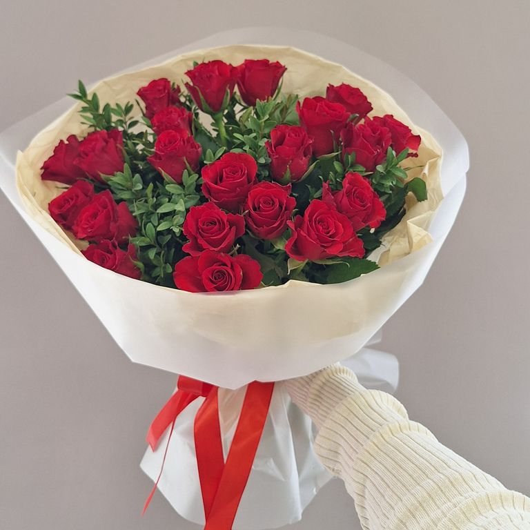 Яркий букет с небольшими розами и зеленью.
