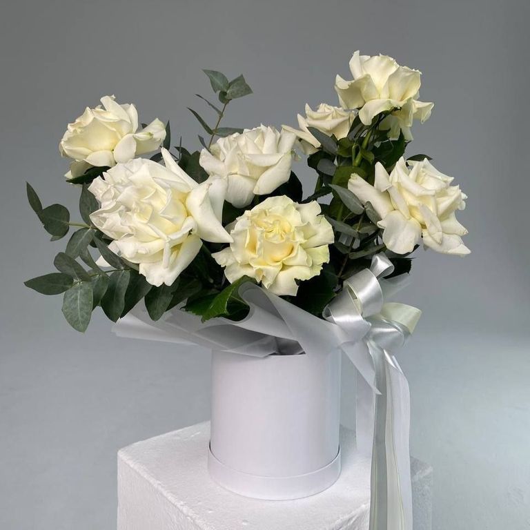 Букет с белоснежными розами в шляпной коробке, которому будет рада любая девушка.