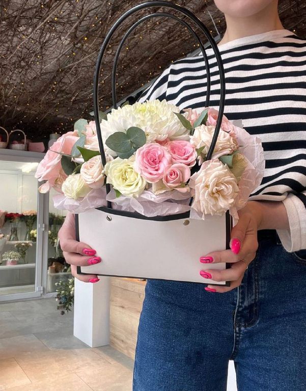 Милый букет в сумочке из свежих цветов будет долго радовать получателя.