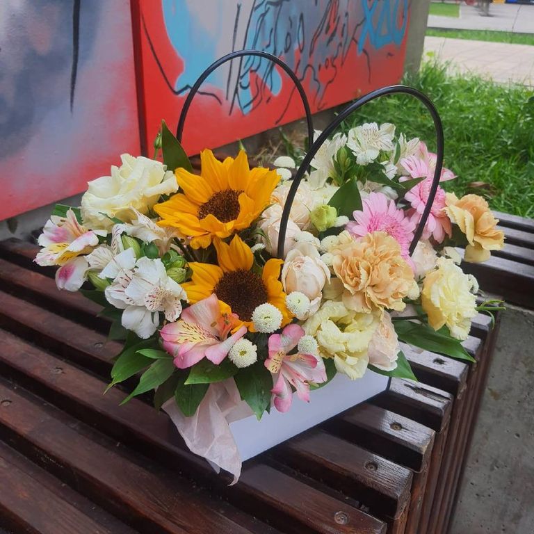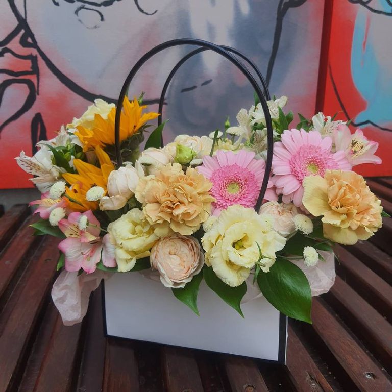 Красивый букет в сумочке с нежной альстромерией, гермини, лизиантусом, гвоздикой, яркими подсолнухами и зеленью.