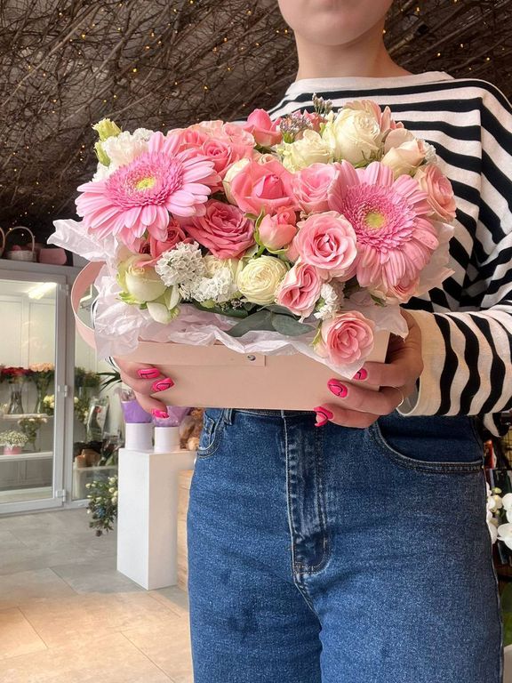 Нежный букет в розовых оттенках в стильной сумочке.