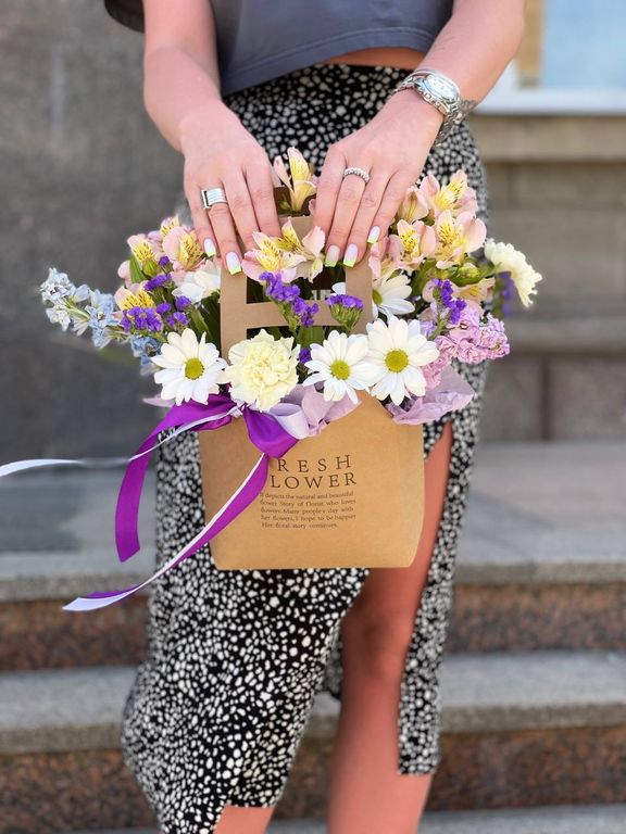 Цветочная композиция в сумочке - один из самых оригинальных подарков, у нас большой выбор различных форм и цветов.