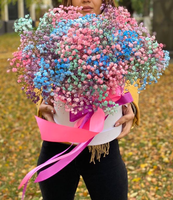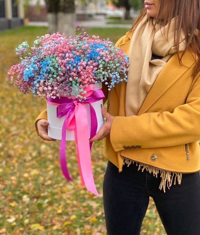 Невероятная коробка с радужной гипсофилой, легкая и яркая.