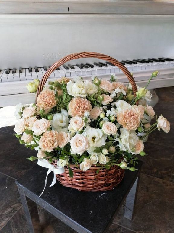 Шикарная корзина с лизиантусом, гвоздикой и кустовой розой.