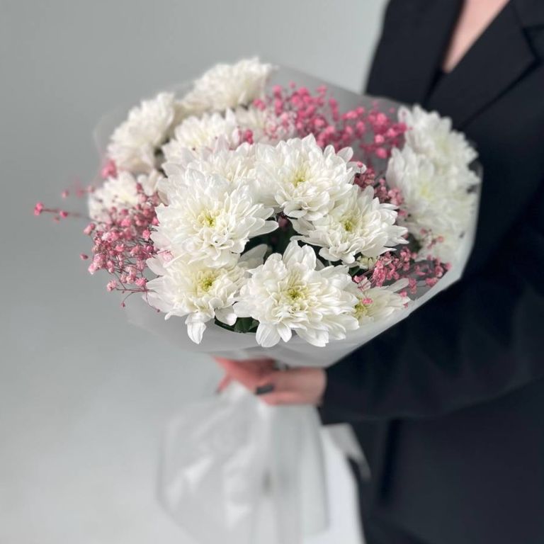 Лёгкий, воздушный и стильный букет для тёплого жеста внимания. Белоснежные хризантемы в сочетании с розовой гипсофилой создают нежную и необычную композицию, которая идеально подойдёт для комплимента, поздравления или как приятный сюрприз без повода.