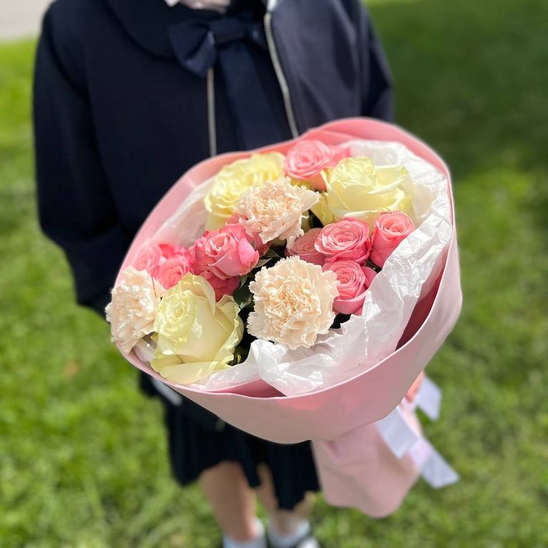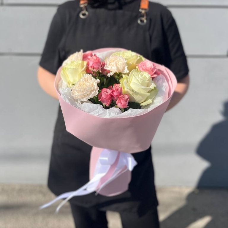 Мини-букет с розами и диантусами, отлично подходящий в качестве подарка на любой повод и праздник.
