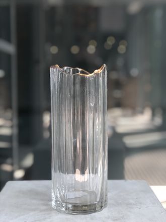 Стеклянная ваза для ваших букетов с необычным горлышком с золотой каёмкой.